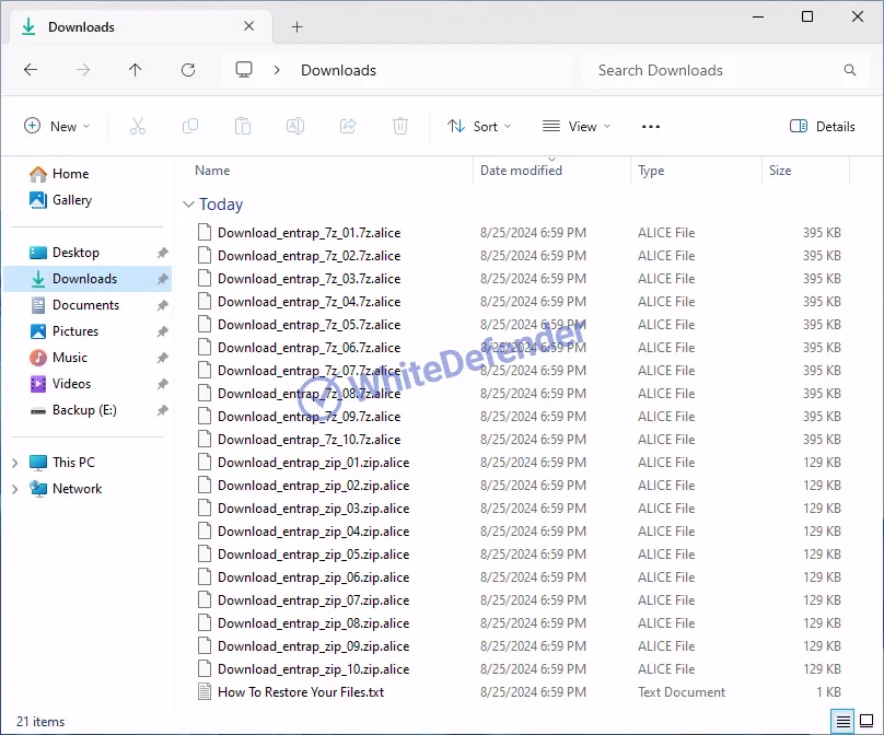 暗号化されたファイルは「.alice」拡張子が付与され、復旧手順が記載されたテキストファイルが残置されます。
