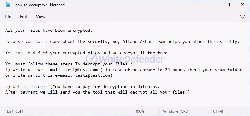 身代金要求ファイルは、各フォルダ内に「how_to_decrypt.txt」という名称で生成されます。暗号化が完了したファイルは、「元のファイル名.元の拡張子.allahuakbar」へとリネームされます。暗号化完了後、当該のテキストファイルが実行されます。