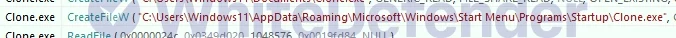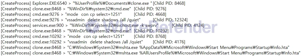 CloneランサムウェアはC++ベースで開発されており、Dharma(ダルマ)ランサムウェアの亜種と見られます。実行時、ミューテックス(Mutex)を用いて多重起動を防止する機構を有しています。また、暗号化完了後、レジストリに特定値を登録することで重複処理を防ぐ機能も確認されています。ランサムウェアは起動直後、データ関連の特定のサービスおよびプロセスを列挙し、それらを停止または終了させます。暗号化処理においては、ユーザーによるデータ復元を困難にするため、ボリュームシャドウコピー(VSS)を削除します。暗号化完了後、実行ファイル形式のランサムノートを表示させます。さらに、スタートアップフォルダにランサムウェア本体およびランサムノートを登録し、持続性(Persistence)を確保しようとします。