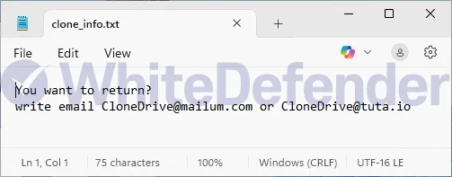 身代金要求ファイル(ランサムノート)は、暗号化完了後、各ルートドライブおよびデスクトップ上に「clone_info.txt」として生成されます。また、システムフォルダ(system32)内に「mshta.exe」という名前でファイルが生成されることも確認されています。暗号化が適用されたファイルは、すべて「<元のファイル名.拡張子.id-個人Key8桁.[CloneDrive@mailum.com].Clone>」の形式に変更されます。