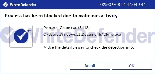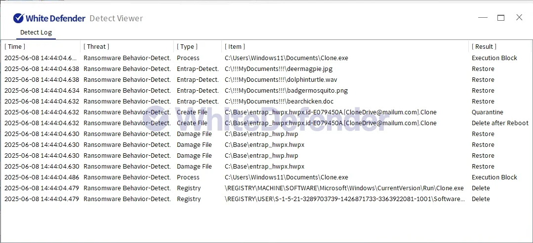 本製品(ホワイトディフェンダー)は、ランサムウェアの悪意ある挙動を検知し、暗号化処理が進行する前にリアルタイムで自動復元をサポートします。