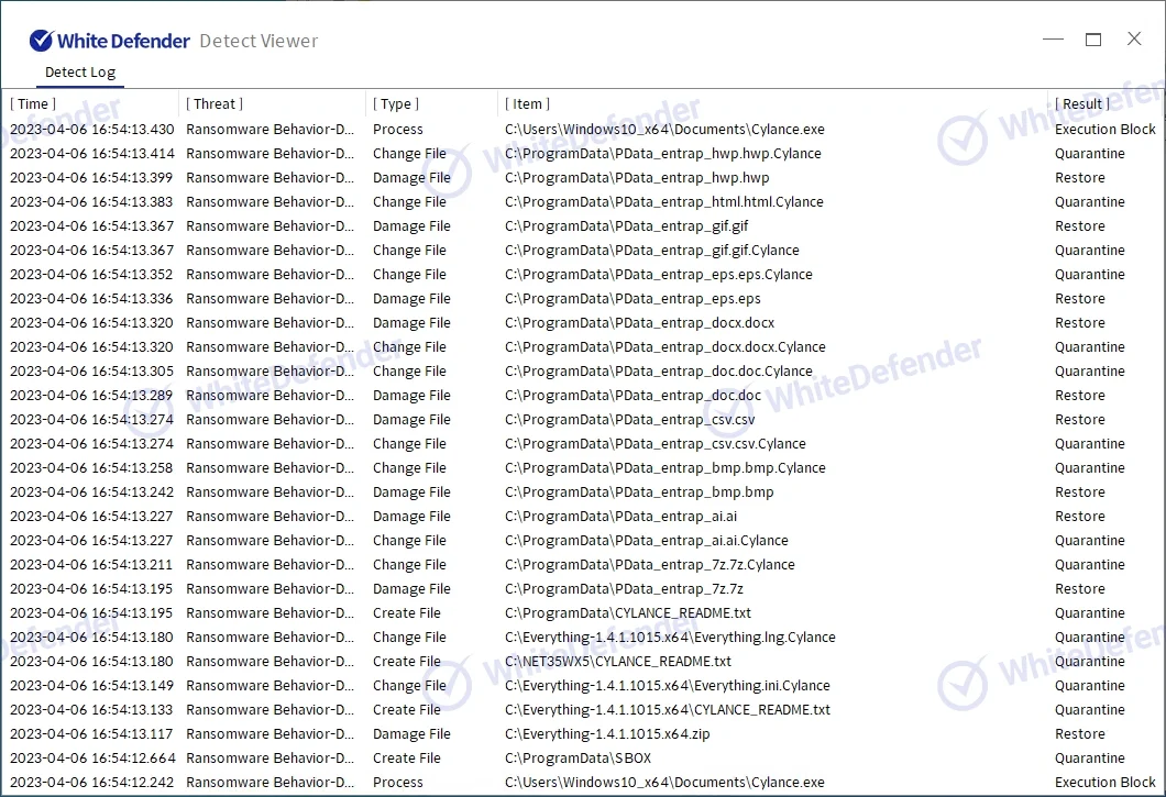 本製品(WhiteDefender)は、ランサムウェアの悪性動作を検知し、暗号化処理が実行される前にファイルをリアルタイムで自動復元する機能をサポートしています。