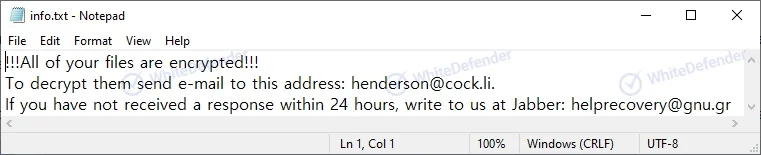 身代金要求ファイル(ランサムノート)は、暗号化された各フォルダ内にinfo.txtおよびinfo.htaという名前で生成されます。