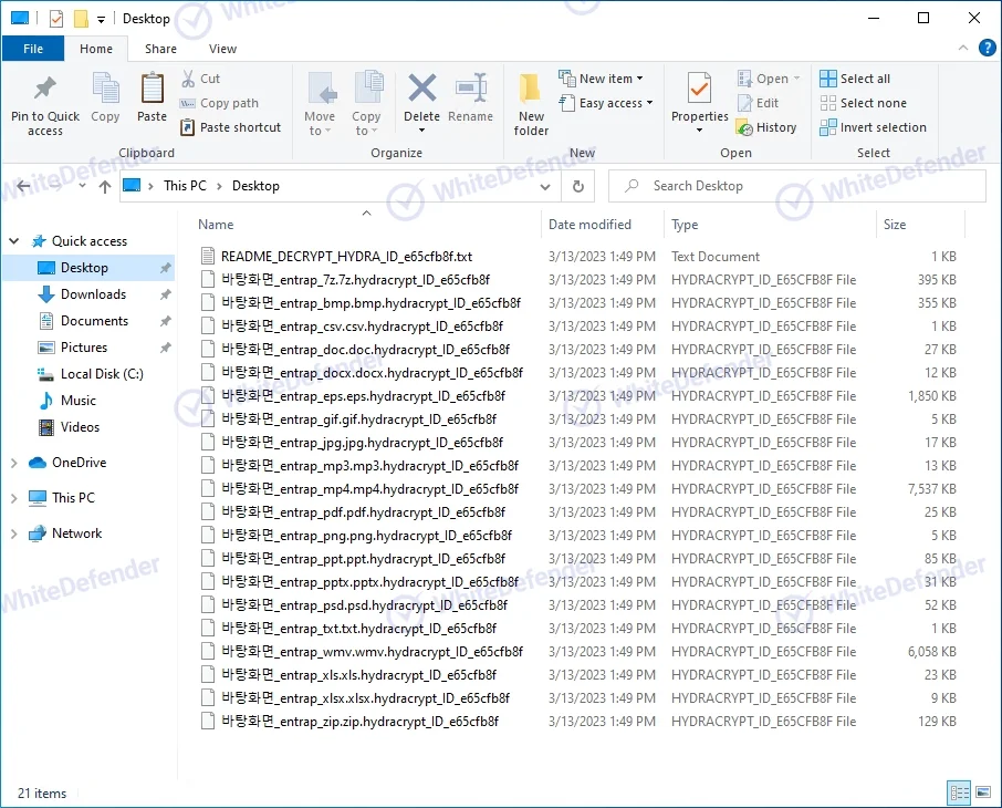 暗号化が完了すると、ファイル名は「<元のファイル名.元の拡張子.hydracrypt_ID_個人キー>」へと変更されます。また、身代金要求ファイル(ランサムノート)はデスクトップ上に「README_DECRYPT_HYDRA_ID_個人キー.txt」という名称で生成されます。