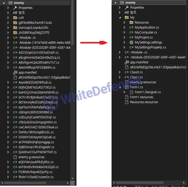 <内部コードが難読化されている状態(左)と復号後の状態(右)>