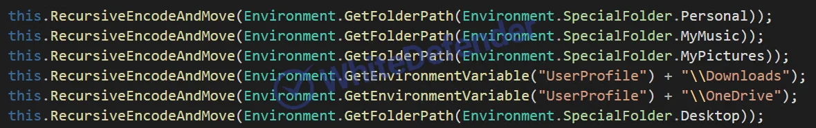 本マルウェアは.NET VB環境で作成されており、内部構造の解析を困難にするための商用レベルの難読化機能が適用されています。追加のドライブは標的とせず、ユーザーのライブラリフォルダおよびOneDriveの保存場所のみを対象として動作します。一般的なランサムウェアがランダムな値を生成し、その鍵を攻撃者サーバーへ送信するのとは異なり、本マルウェアは読み込んだファイル値をBase64でリバースした値を保存に使用します。ランサムノートは存在せず、デスクトップ上に公開ドメインを明記するに留まっています。この挙動から、不特定多数を対象とした無作為な拡散ではなく、特定の企業を標的とした攻撃である可能性が高いと推測されます。