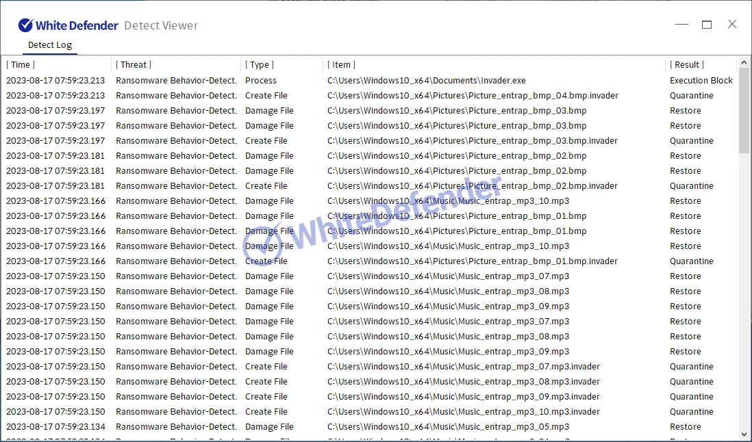 ホワイトディフェンダーは、ランサムウェアの悪性動作を検知し、暗号化が実行される前に、対象となるファイルに対してリアルタイム自動復元機能をサポートします。