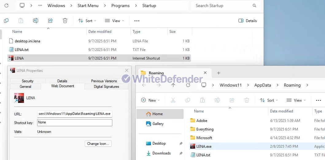 LenaランサムウェアはC#/.NETを基盤として開発されたChaosランサムウェアの亜種と見られます。感染時、システム復旧を無力化するため、シャドウコピーおよびバックアップカタログを削除します。さらに、Windowsの復元機能とエラー通知機能を無効化します。基本的にはWindowsのルートドライブを標的としますが、他のドライブには「surprise.ex」ファイルを生成し、リムーバブルメディア経由での二次感染を誘発する可能性があります。また、持続性を確保するため、実行ファイルを%AppData%Roamingパスへコピーし、Windowsのスタートアップフォルダにショートカットリンクを作成し、再起動後も継続的に実行されるように設定します。