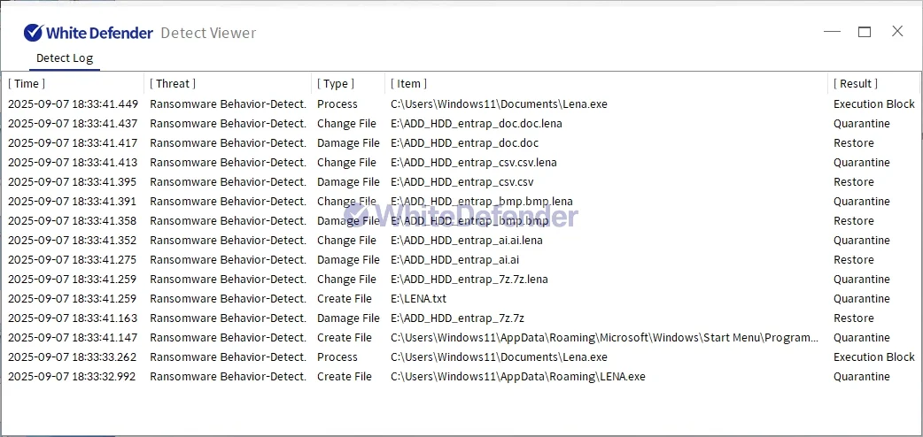 特定のセキュリティ製品(例:WhiteDefender)は、ランサムウェアの悪性動作や暗号化処理の前に、対象ファイルのリアルタイム自動復元機能を提供します。