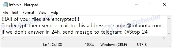 身代金要求に関する案内ファイルは、各フォルダ内にinfo.txtおよびinfo.htaという名前で生成されます。