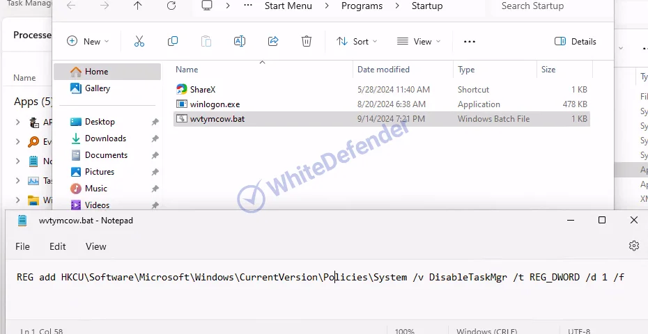 <スタートアップフォルダにコピーされたランサムウェアとタスクマネージャー無効化用のバッチファイル>