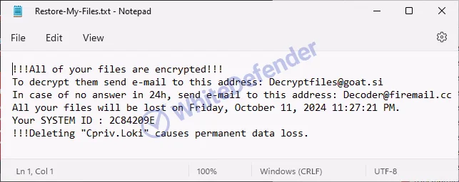 暗号化処理完了後、各フォルダ内に身代金要求ファイルとして「< Restore-My-Files.txt / Crpiv.Loki / info.hta >」という名称のファイルが生成されます。暗号化されたファイルは「<元のファイル名.元の拡張子.Loki>」へと拡張子が変更されます。