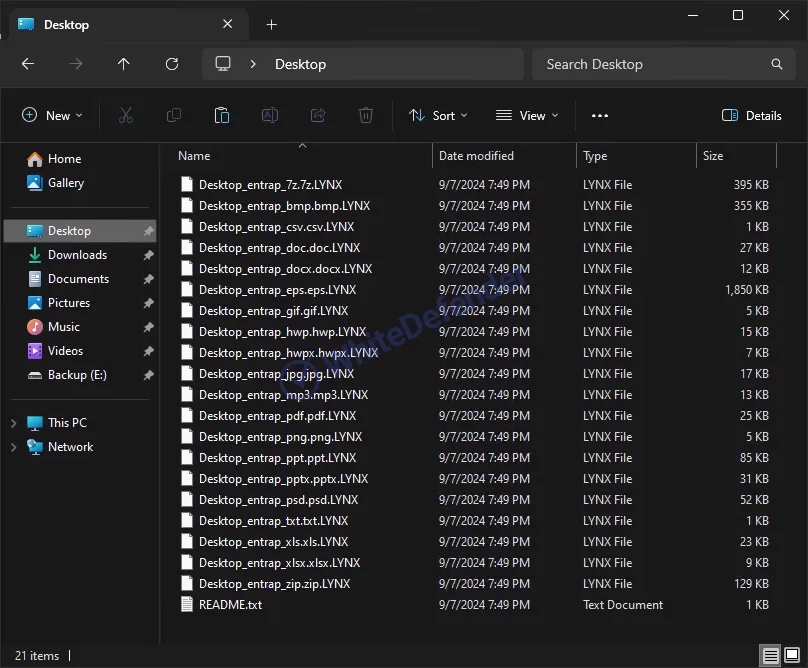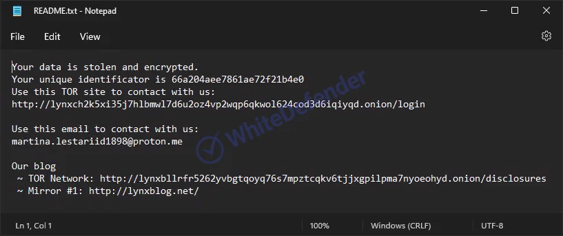 暗号化が完了した後、身代金要求メモは各ディレクトリ内に「README.txt」という名称で生成されます。暗号化されたファイルは、元のファイル名に「.Lynx」という拡張子が追加されます(例:ファイル名.拡張子.Lynx)。
