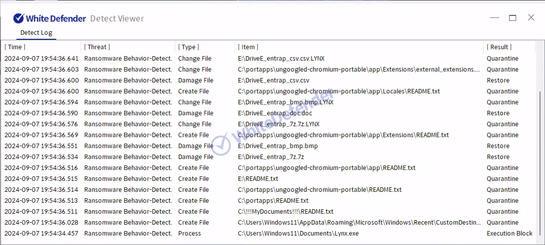 ホワイトディフェンダーは、ランサムウェアの悪性動作を検知し、暗号化が進行する前にファイルのリアルタイム自動復元機能を提供します。