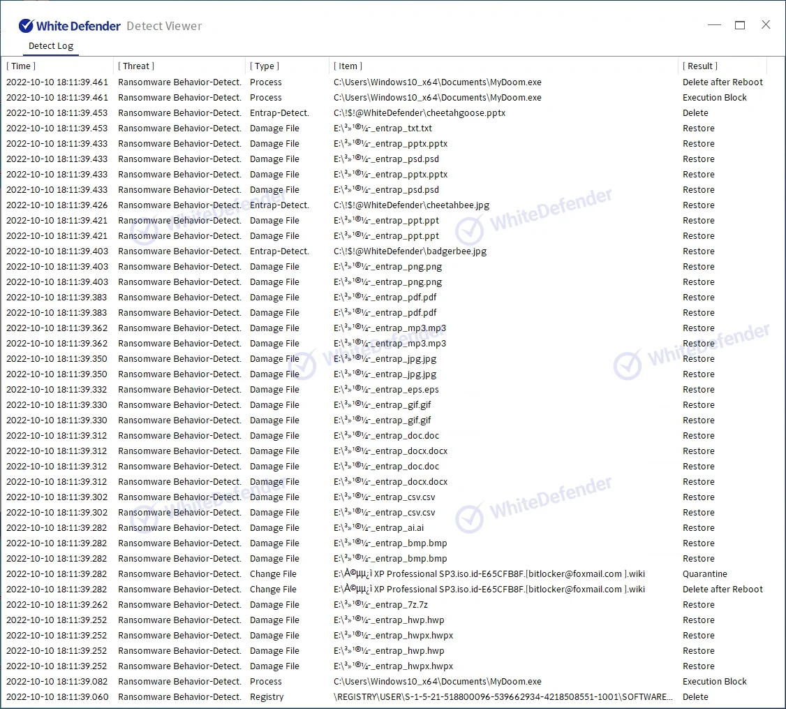 MyDoomランサムウェアは、感染したシステム上のファイルを暗号化し、特定の形式の拡張子(例:.既存拡張子.id-生成された個人キー.[bitlocker@foxmail.com].wiki)に変更する挙動が確認されています。