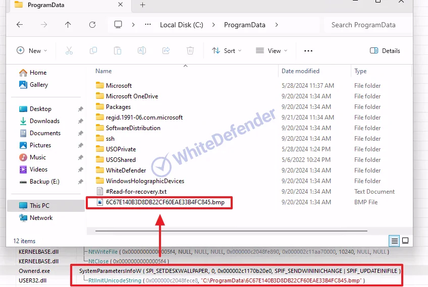 暗号化完了後、ProgramData フォルダ内に、生成された秘密鍵を埋め込んだ画像ファイルを作成し、さらにその画像をデスクトップの背景画像として設定します。攻撃完了後、身代金要求メモ(ランサムノート)が実行されます。さらに、Windowsへの再ログインのたびに、このノートの内容がシステムメッセージボックスとして繰り返し表示されます。