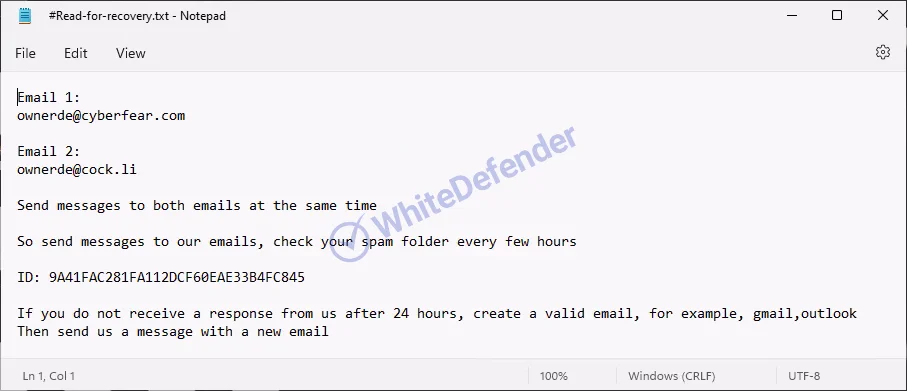 暗号化処理が完了すると、各ディレクトリに #Read-for-recovery.txt という名称の身代金要求ファイルが生成されます。暗号化されたファイルは、元のファイル名に <파일명.확장자.[ownerde@cyberfear.com].ownerd> というサフィックスが付与された状態に変更されます。