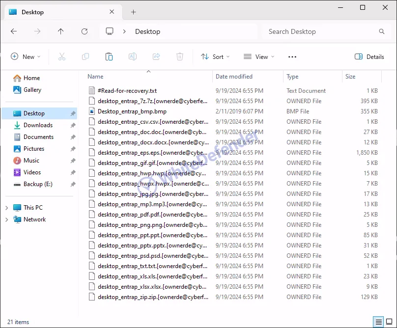 本稿で分析対象とするランサムウェアは「Ownerd」と呼称されており、感染環境下のファイルを特定の手法で暗号化し、身代金を要求します。暗号化されたファイルは、拡張子を .[ownerde@cyberfear.com].ownerd に変更する特徴が確認されています。