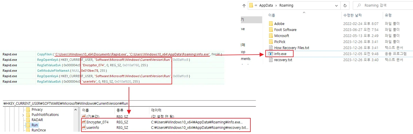 初期実行時、マルウェア本体はユーザープロファイル内のRoamingフォルダに「info.exe」としてコピーされ、スタートアップレジストリに登録されます。さらに、タスクスケジューラに登録され、Windowsログオン時および1分間隔での繰り返し実行が設定されます。難読化に使用された鍵情報は、レジストリの特定箇所に追記保存されます。