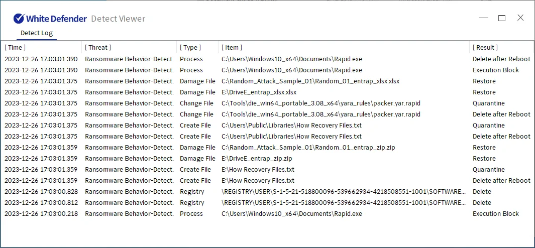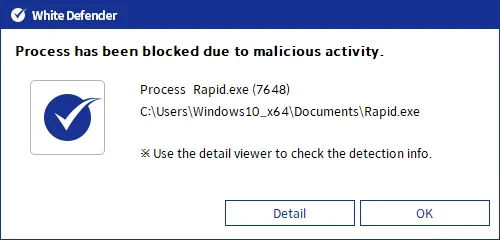 本マルウェアの活動に対し、弊社製品「WhiteDefender」は、ランサムウェアの悪性動作を検知・遮断するだけでなく、暗号化処理が進行する前のファイルに対してもリアルタイムでの自動復元機能をサポートしております。