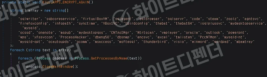 本ランサムウェアはC# .NETを基盤として開発されており、二重暗号化を防ぐため、実行前にレジストリ内の特定キー値をチェックし、過去の感染履歴の有無を判定します。暗号化処理を実行する前に、被害を最大化するためにセキュリティソリューションやデータ関連の主要プロセスを強制終了させた後、システム内のファイル暗号化を本格的に開始します。さらに、クリップボードハイジャック機能を内包しており、暗号資産の支払いアドレスを横取りする機能を有しています。被害者が暗号資産の支払いまたは送金のためにウォレットアドレスをコピーした瞬間に、クリップボードの内容が攻撃者のアドレスに自動的に置き換えられ、金銭的損失を誘発する可能性があります。