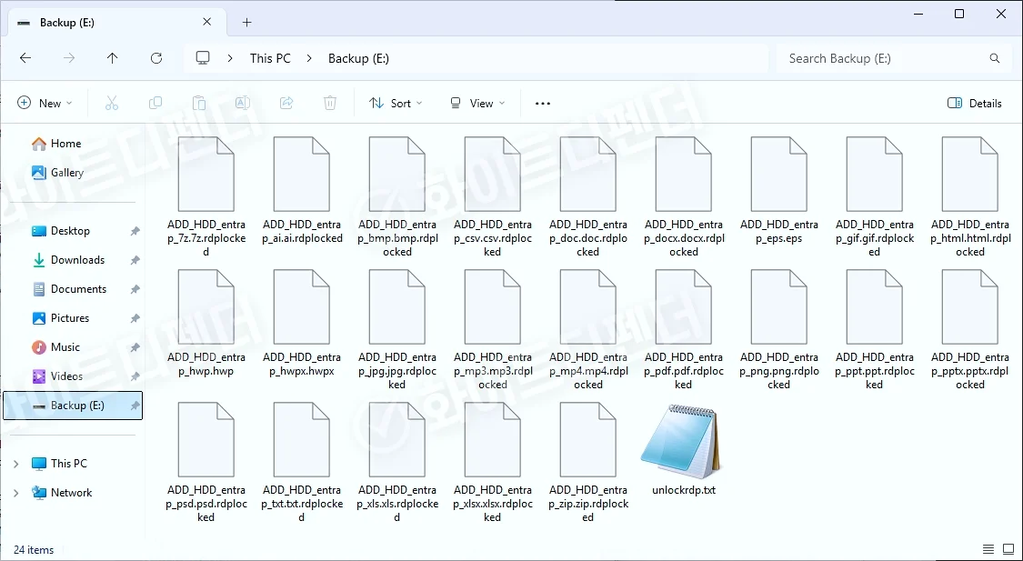 暗号化完了後、各フォルダ内に「unlockrdp.txt」という名称の身代金要求ファイルが生成されます。暗号化されたファイルはすべて「<元のファイル名.拡張子.rdplocked>」に変更されます。
