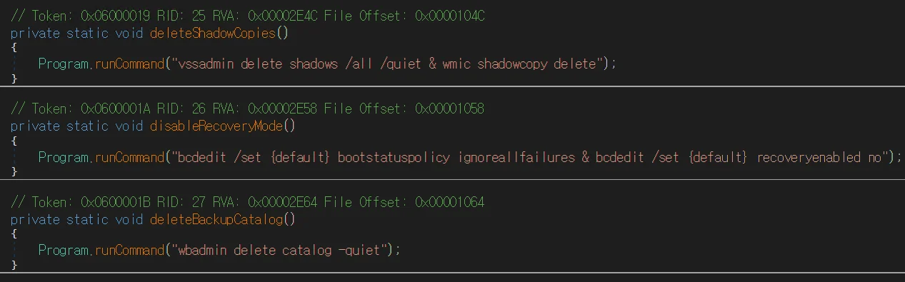 • 重複実行を防ぐためのチェック機構を有しています。感染活動の一環として、シャドウコピー(Volume Shadow Copy)およびバックアップカタログを削除し、Windowsのシステム復元機能やエラー通知機能を無効化することで、被害からのシステム回復を意図的に妨害します。