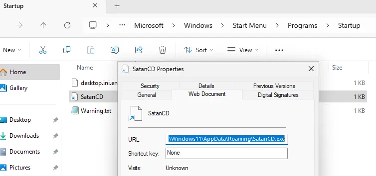 • SatanCDランサムウェアはC#/.NETフレームワークを基盤として開発されています。初回実行時、自身の実行ファイルを %APPDATA%Roaming フォルダ内にコピーし、そこから再実行する挙動を示します。