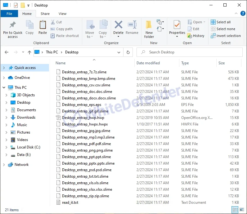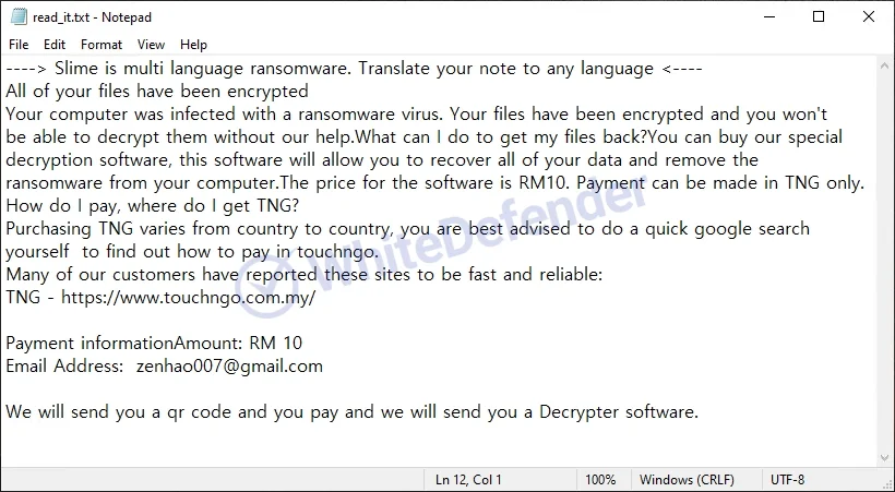 身代金要求ファイルは、感染経路に応じて各ディレクトリに「read_it.txt」として生成されます。暗号化が完了したファイルは「ファイル名.拡張子.slime」へと拡張子が変更されます。