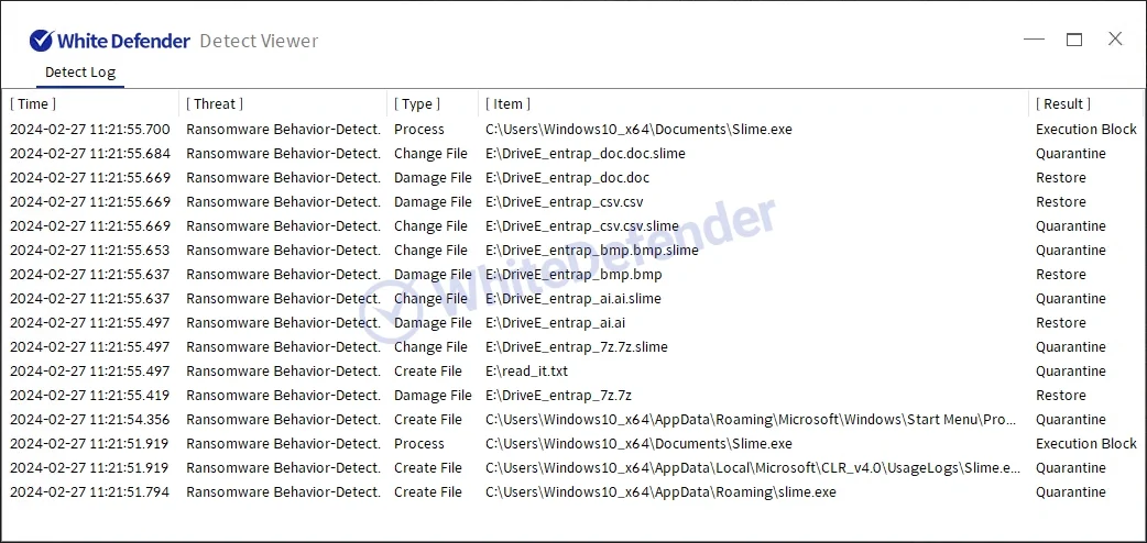 本製品(ホワイトディフェンダー)は、ランサムウェアの悪性動作を検知し、暗号化処理が実行される前に、対象となるファイルに対してリアルタイム自動復元機能を提供します。