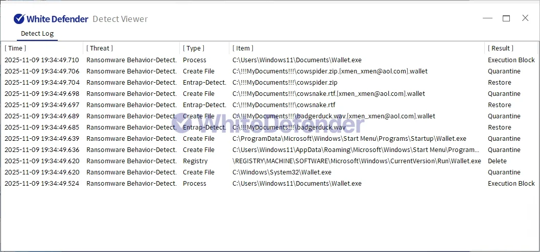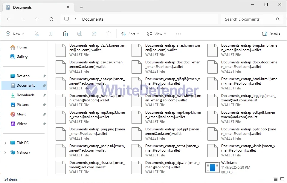 本ランサムウェアは「Wallet」と呼称されており、感染したファイルの拡張子を .[xmen_xmen@aol.com].wallet へ一括で変更する挙動が確認されています。